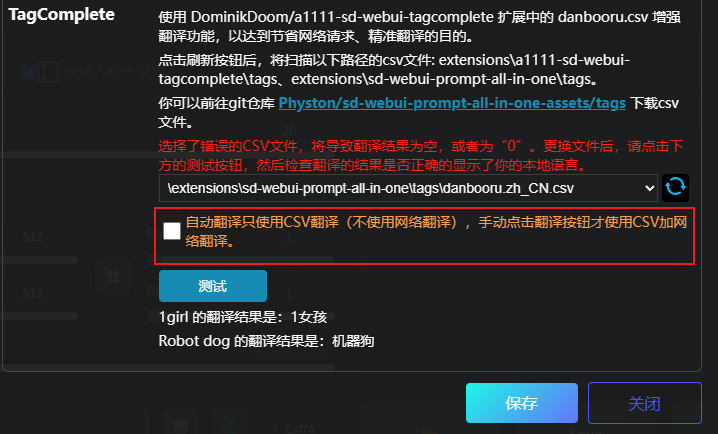 If you only want to use CSV for translation during automatic translation and not use the network translation API, then select the following option. After selecting, only when you manually click the translation button will the network translation API be used.
