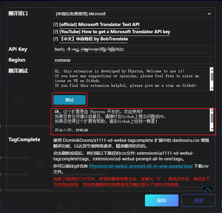 Click the "Test" button. Check whether the translation result is correct. In the test result, the English word is in front, and the translation result in your language is at the back. If the translation result at the back is not correct, please check whether your CSV file is correct, otherwise do not enable this function.