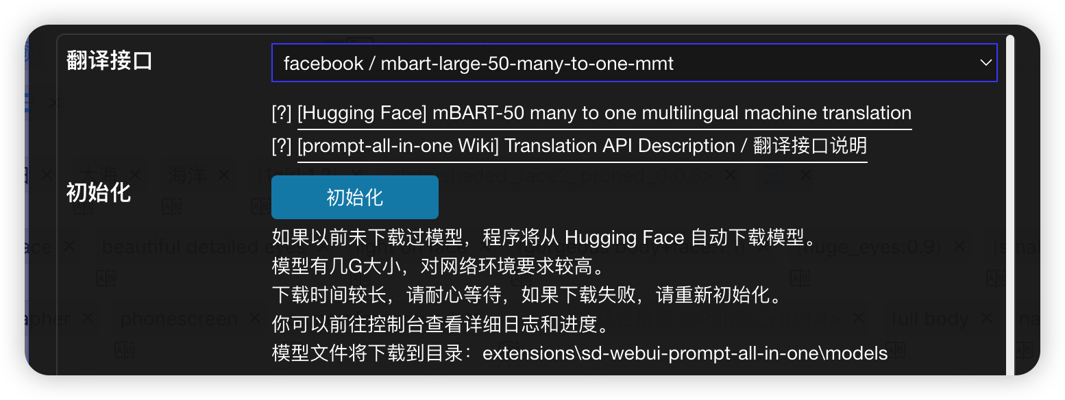 mbart-large-50-many-to-many-mmt.zip文件解压到\extensions\sd-webui-prompt-all-in-one\models\mbart-large-50-many-to-many-mmt目录。