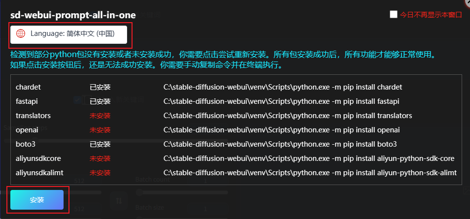 在某些情況下,安裝完成並重啟 WebUI 後,本擴展所需的 Python 軟體包可能無法自動安裝。這時候本擴展會彈出安裝視窗,你需要手動安裝。